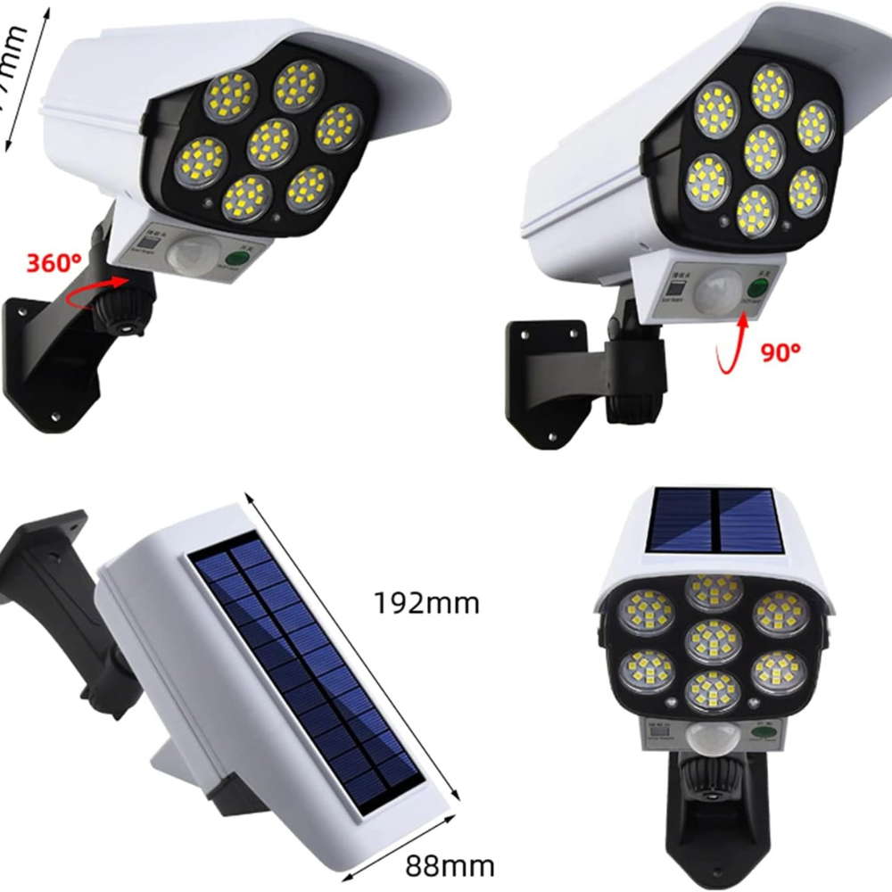 Son format réaliste renforce la perception de surveillance, tandis que ses 77 LED diffusent un éclairage puissant et homogène. Résultat : votre façade, jardin, garage ou entrée restent visibles et protégés, même dans l’obscurité totale.